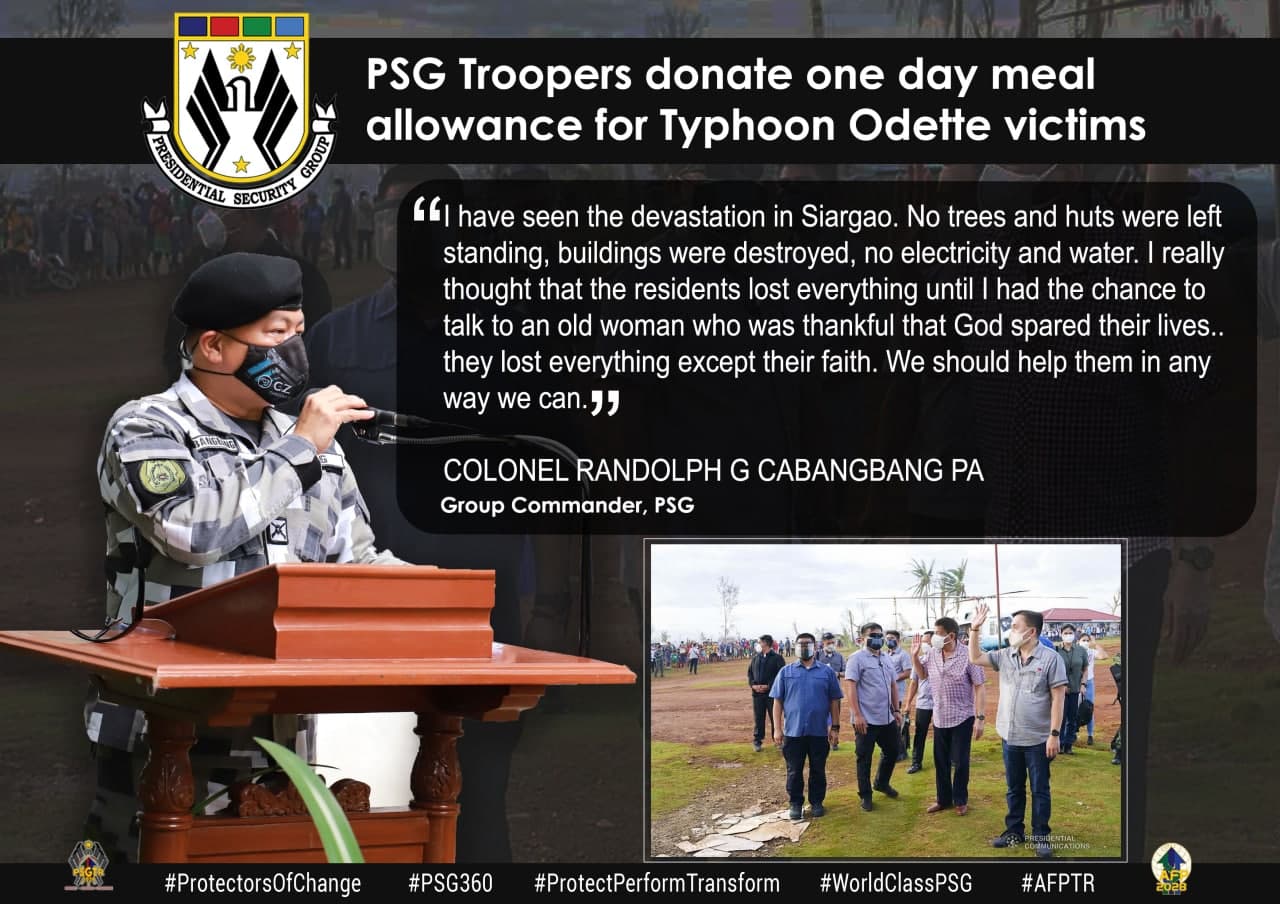 The Presidential Security Group (PSG), under the leadership of COLONEL RANDOLPH G CABANGBANG PA, donated their one-day Subsistence (Meal) Allowance to provide assistance to those affected by Typhoon Odette in Siargao.